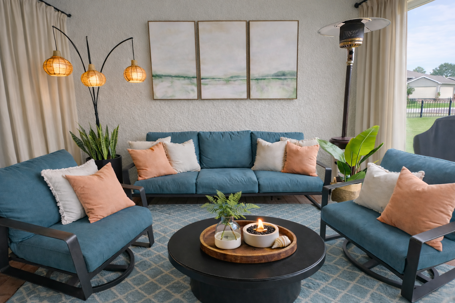 Of course, the space wasn’t just for the kids. Mom and dad wanted to bring in a minimal, coastal Florida feel — on a budget — while keeping several existing elements in place. We preserved their current paint color, flooring, patio furniture, and outdoor heater, and focused on creating cohesion through layered textures, a soft coastal palette, and intentional contrast.